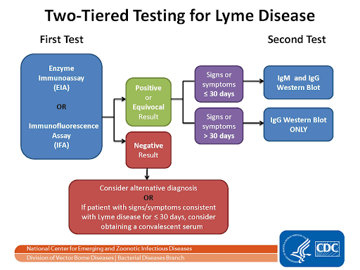 The ELISA test and the Western Blot test are combined together to form what is referred to as a two step testing by the CDC to diagnose Lyme disease.